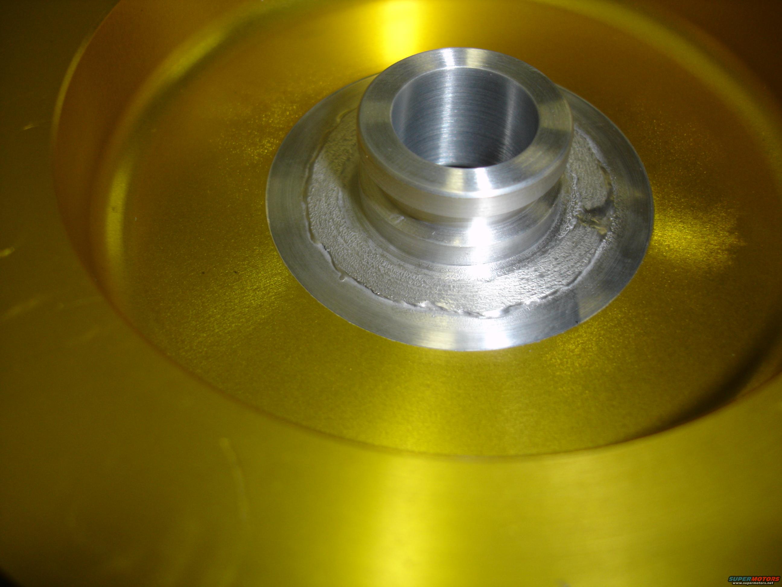 Since I did the saginaw swap I had to have the pulley machined for the bigger shaft on the new pump. I had the machine shop bore out the whole center of the pulley and start over. I wanted the pulley to line up perfectly and didn't want to have to use washers between the bracket and pump.
