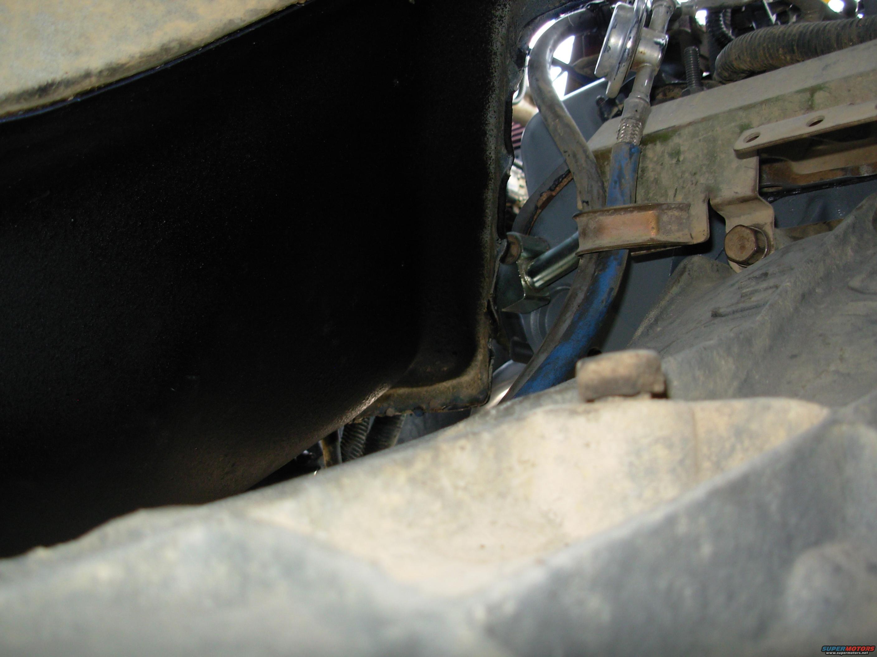 Because of the body lift, the block at the L end of the crossover tube on the back of the heads comes VERY close to the body. When the engine rocks hard, it hits.