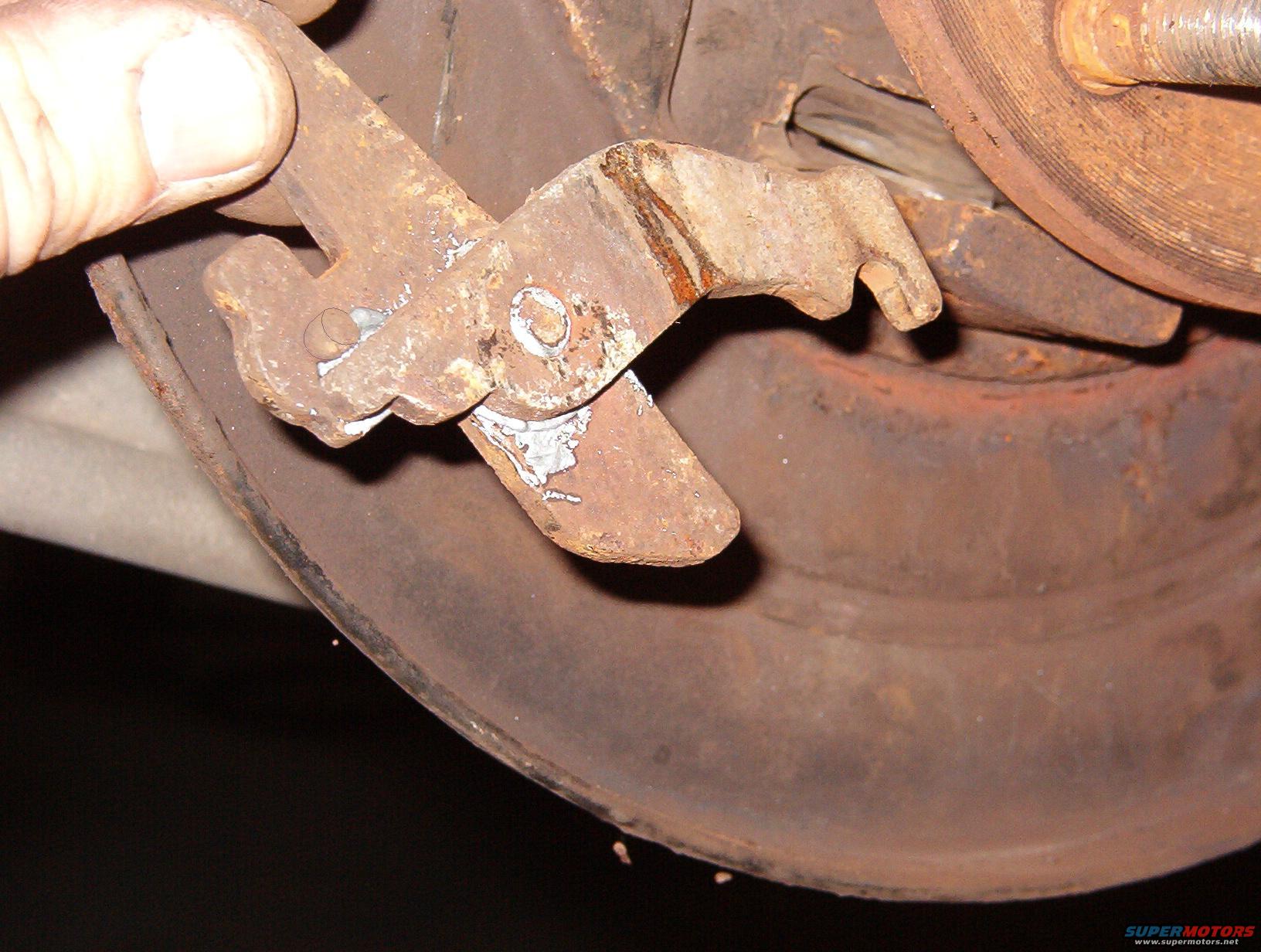 Pull the e-brake cable sheath out of the loop on the backing plate & slide the cable out of the notch. Then unhook the cable from the lever. With some effort, the levers can be removed from the backing plate, away from the caliper area. If they can be separated, the process is much easier. These were seized together at the pivot pin, so I wire-brushed them & applied anti-seize before reinstalling them.