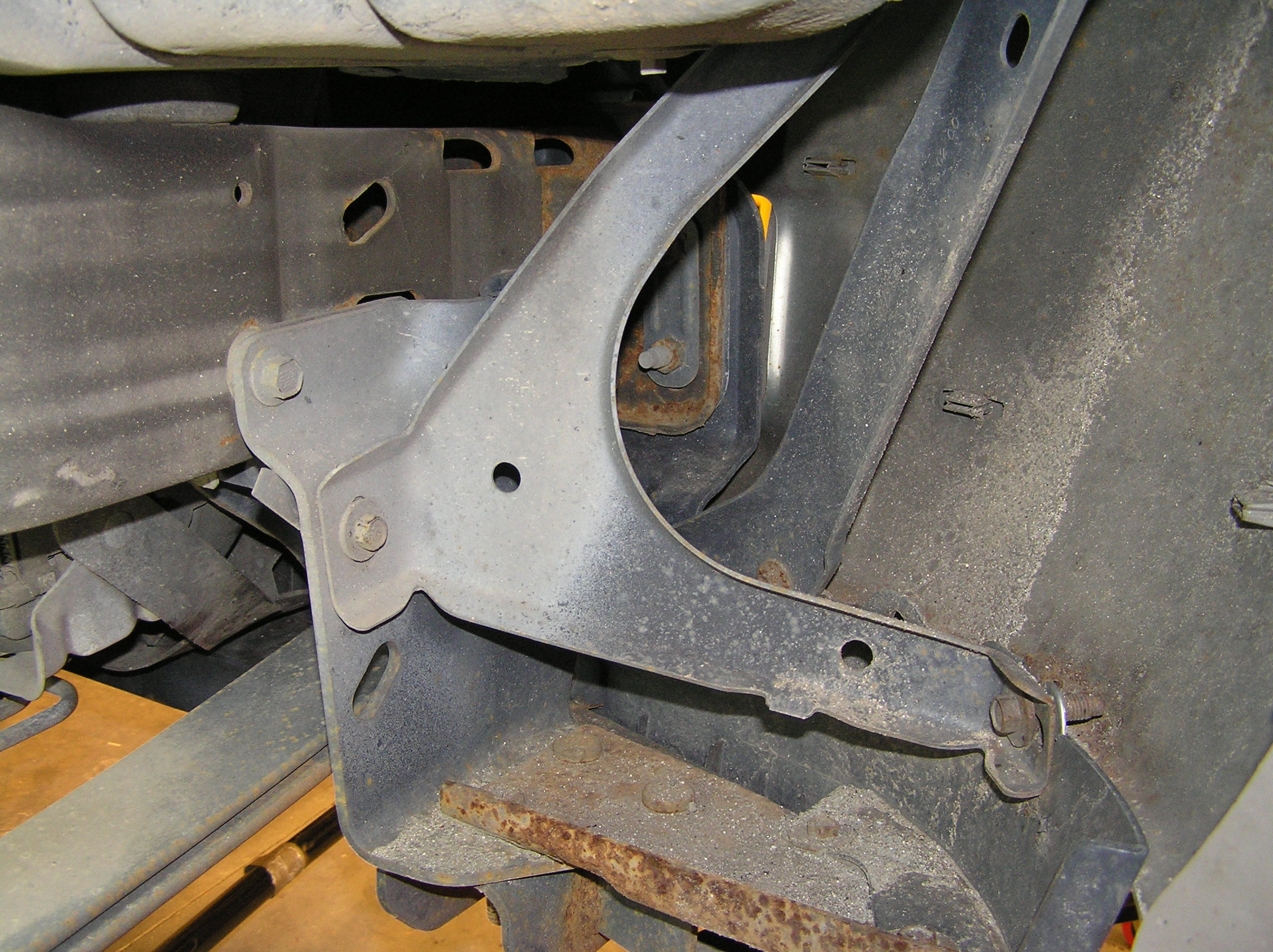 Unfortunately, the front leaf spring eye-bolts are not easy to get to, so you have to remove the corner bumper supports.