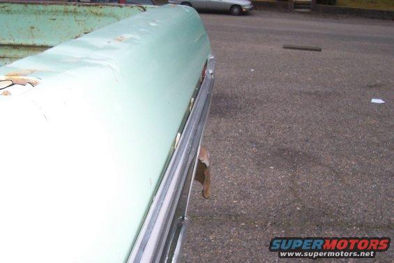 left side of bed. Notice dents on bed rail and the chrome side moulding is seperating from the bed. There is 2 or 3 broken clips under it there. You can pop it back down and it will stay there for a month or two