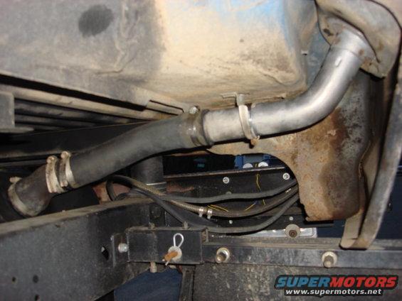 the filler neck was next since the newer version has a screw in cap not twist on. and there is a filler tube that goes down in the tank to allower easier filling.. I got a 3" body lift and the stock hose is streach alittle. so i spliced 2 hoses together and made one good new filler hose. you can see the patch at the tank. i chopped one filler neck steel tube and stuck it between both hoses on the inside it is 4" long and only air travels thru the outside larger hose. i did not modify the inside solid hose.