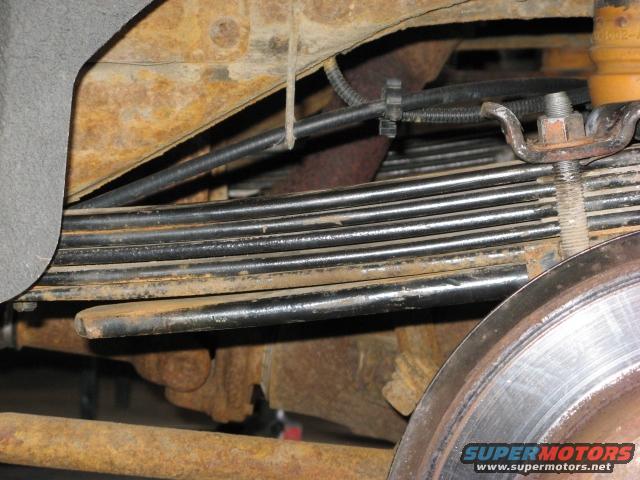 This shows the stance of my modded F code springs with the 3rd leaf from the bottom of the original rear leaf pack (the 38" long leaf) included in the spring pack. (Half a tank of gas). Note that the variable rate leaf is now fully disengaged from the spring pack.