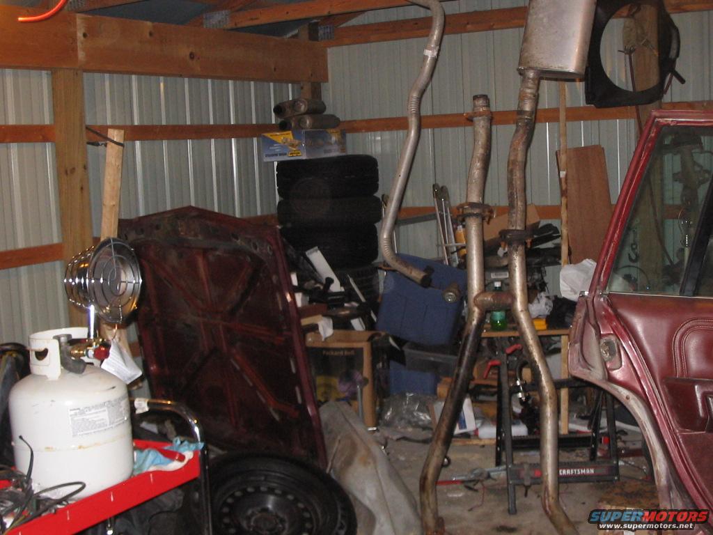 Parts laying around the garage. Hood, exhaust, and fuel tank are easily visible. Dig the little propane heater I got to cut the winter chill in the garage. The fuel tank I don't need, but it's less than two years old and cost me about $115, so it stays. The exhaust is going under the car's replacement, an '81 LTD "tudor" that can be seen elsewhere in my Supermotors galleries.