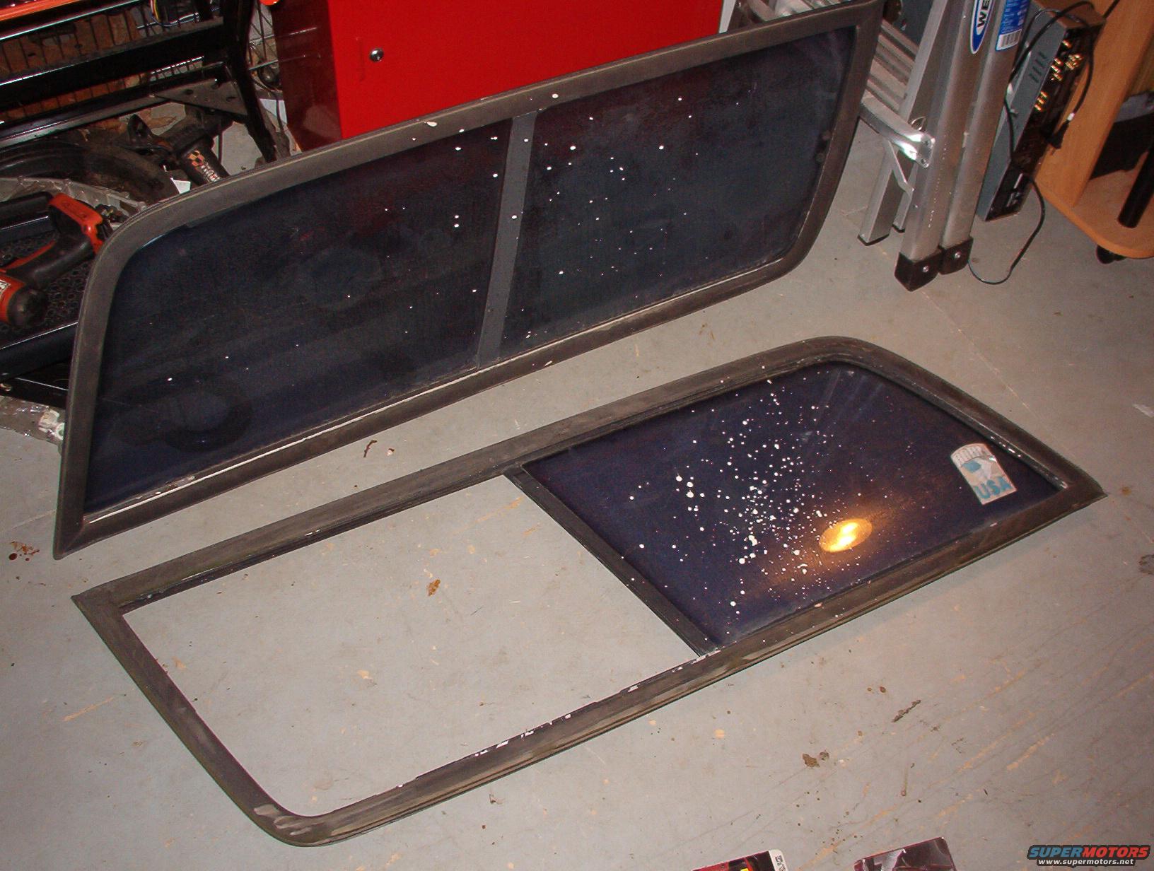 The white crap is apparently paint - IDK how it got spattered on BOTH sides of the truck. But I've cleaned it all off, washed the mud out of the rubber gaskets, replaced the glass runs (as shown in the NEXT 2 pics), and sandblasted & powdercoated the Aluminum frames. But I haven't found replacements for the missing glass & edge yet.