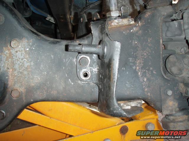 Driver side. Heres a closer shot of that GD bracket. I figure its a shock mount for teh dual shocks. My Bronc not equiped, so I took it of. Took ten minutes to line of the bolt holes on both radius arms. Spent an hour and a half trying with the brackets on.