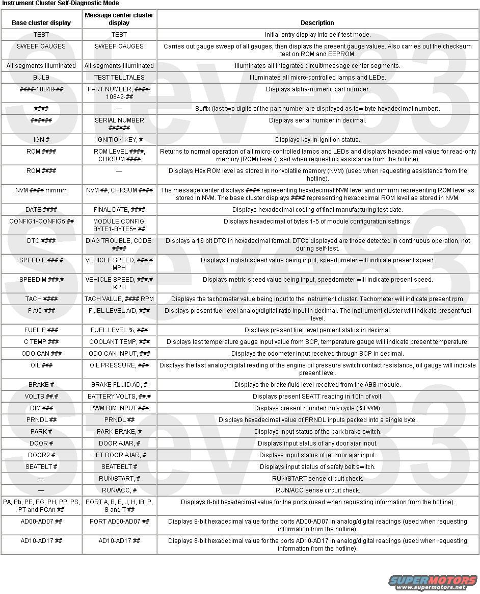 To enter the instrument cluster self-diagnostic mode with the ignition key in the OFF position, press and hold the odometer reset button (except message center cluster) or simultaneously press and hold the message center RESET and SETUP buttons (message center cluster only). Turn the key to the RUN position and hold until the display indicates TEST usually within three to five seconds. Depress the RESET button once to advance through each stage of the self-test.