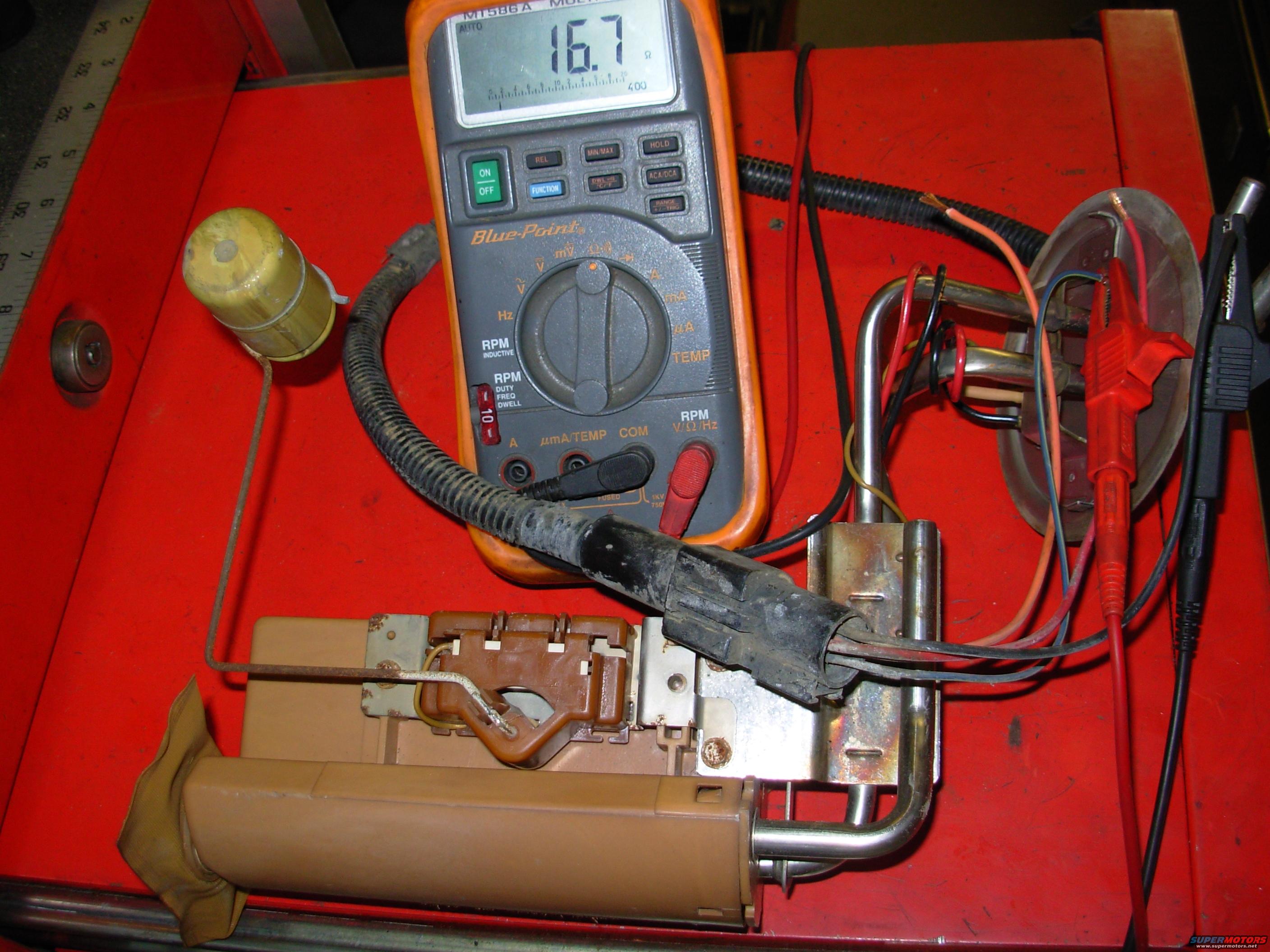 Broncos & front tanks use a hollow brass float as shown. (F-series rear tanks use a solid foam float.) If liquid can be heard splashing inside, or if the float remains wet with fuel, it should be replaced. But with EXTREME care, it can be emptied, polished, and the leaks soldered shut with a common electronics soldering iron & rosin-core solder.
