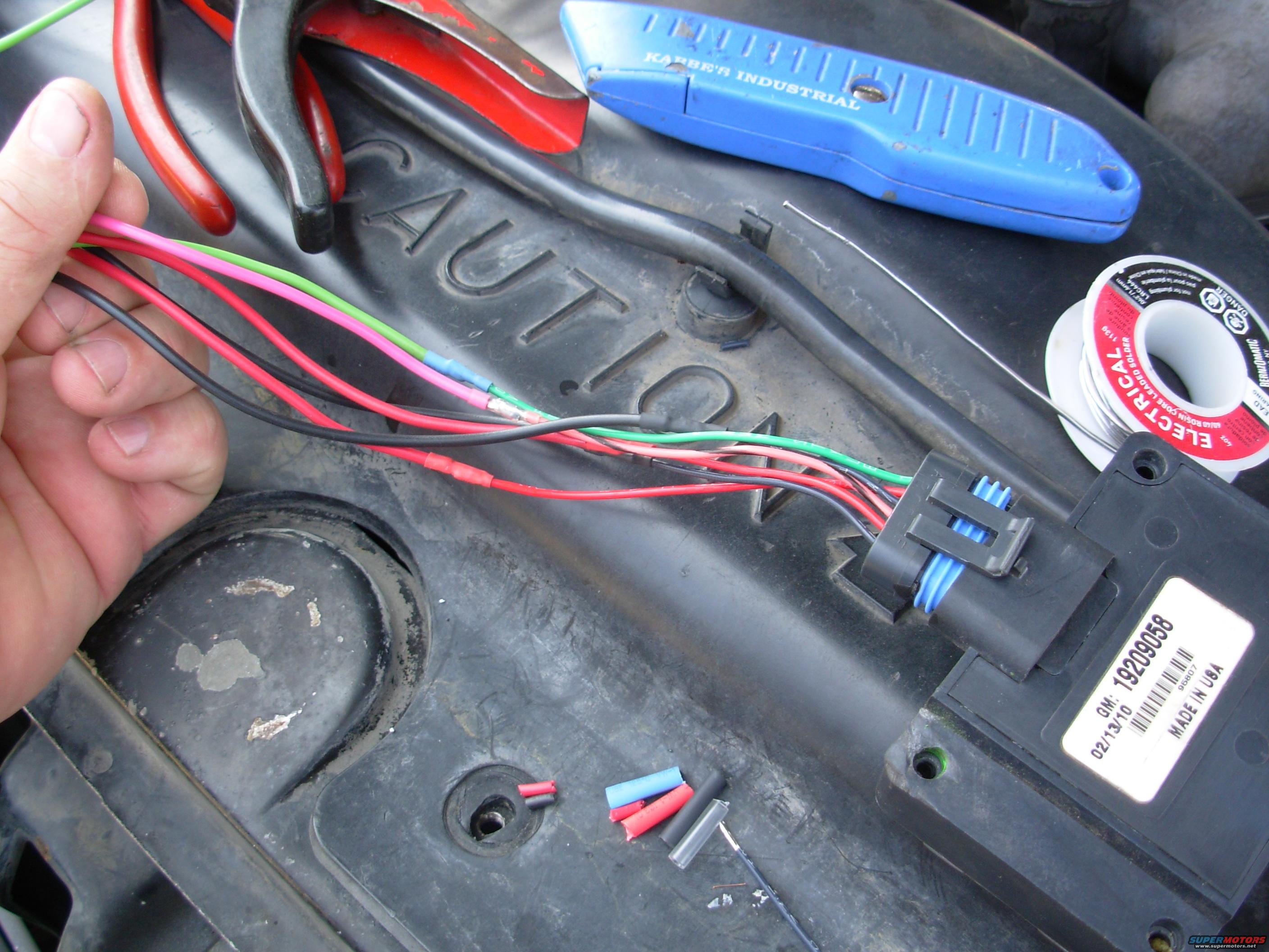 There's clear heat-shrink on the pink wire, and blue on the green wire. Note the staggered cuts that keep the splices from being side-by-side, and make matching the wires easier.