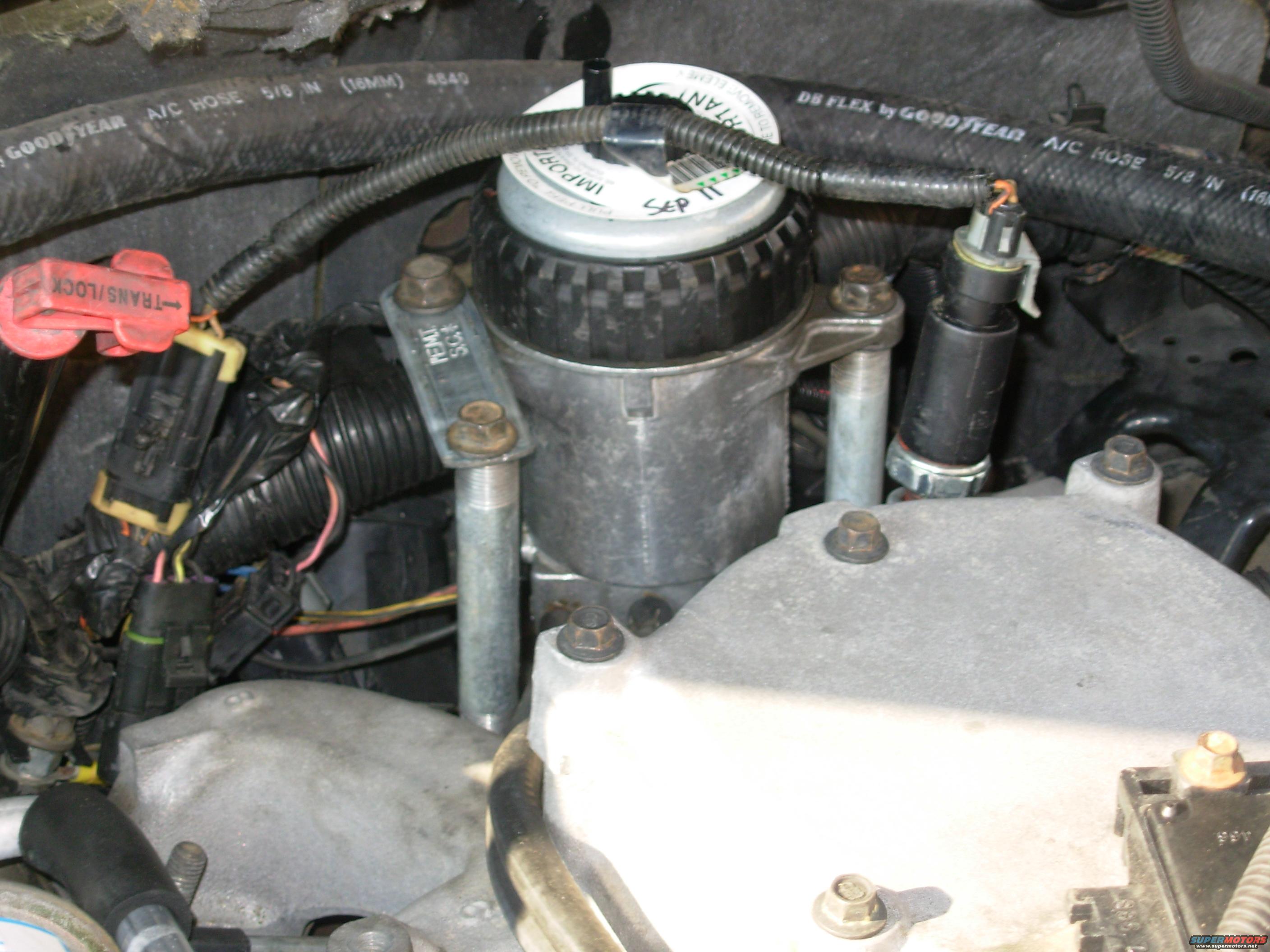 One last trip to the hardware store to get these 4"-long 3/8" pipe nipples, and a 1" EMT 1-hole conduit strap (flattened & drilled). The FFM is secure again, and should be MUCH easier to access. The fuel hoses route neatly along the intake, making future maintenance easier.
