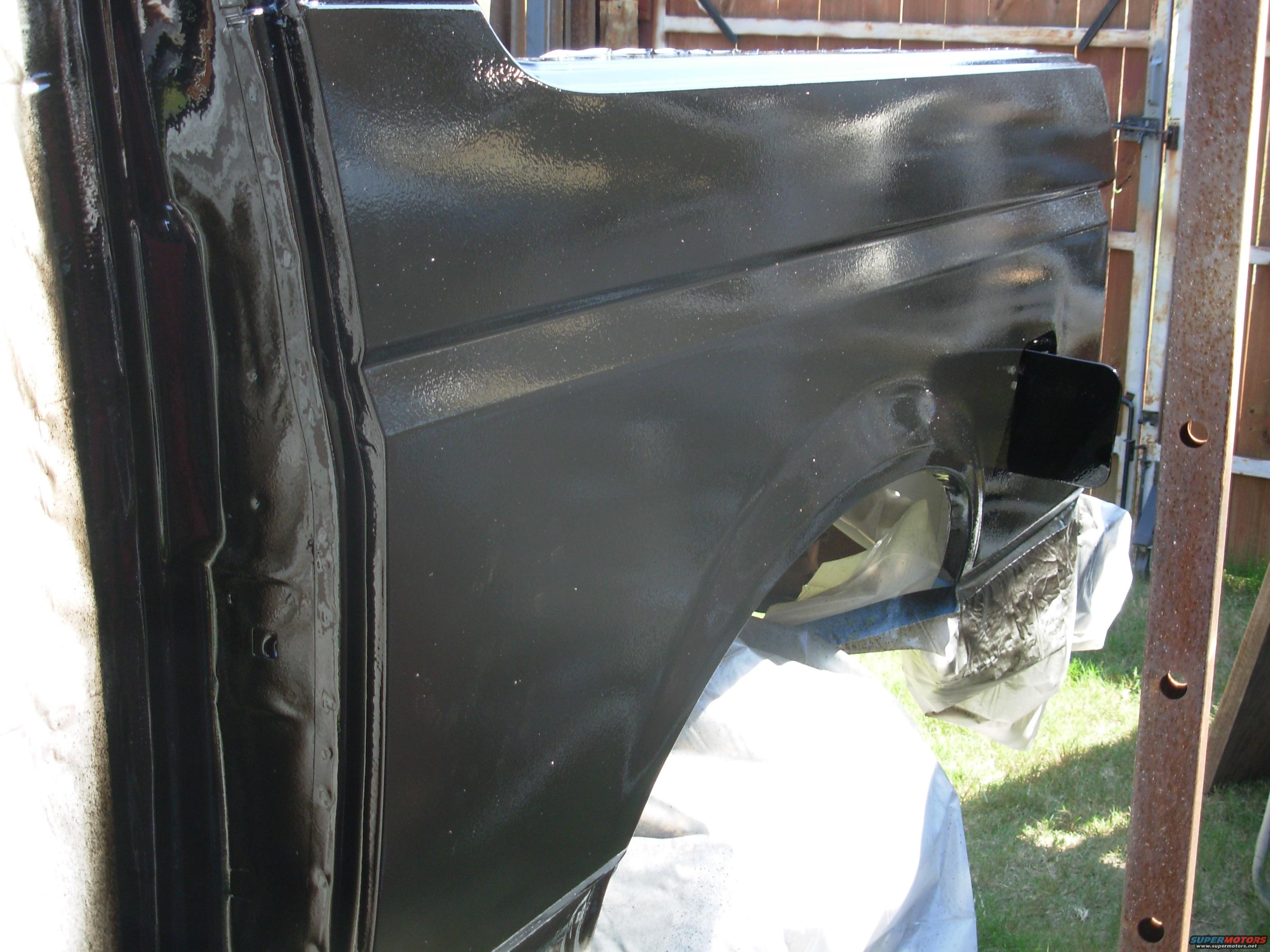 My first coat of Valspar Implement black went on too heavy, and I didn't realize I needed to add hardener, so it's horribly orange-peeled, and taking forever to dry.